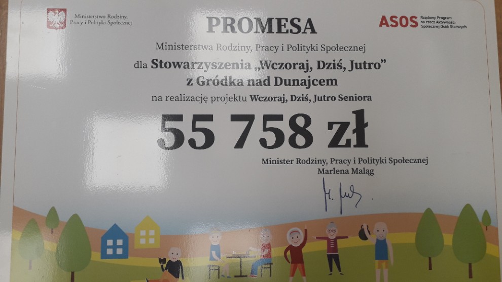 22 czerwca 2020 r. przedstawiciele stowarzyszenia „Wczoraj, Dziś, Jutro” odebrali z rąk sekretarza stanu w Ministerstwie Rodziny, Pracy i Polityki Społecznej Stanisława Szweda promesę na realizację zadania pn. „Wczoraj, Dziś, Jutro Seniora”