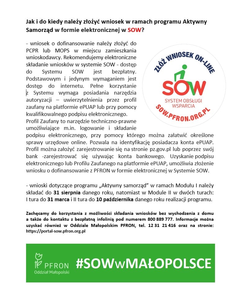 Mając na uwadze bezpieczeństwo osób korzystających ze wsparcia, Oddział Małopolski przypomina o możliwości aplikowania o środki PFRON, będące w gestii jednostek samorządowych, za pośrednictwem platformy internetowej SOW. System Obsługi Wsparcia to nowoczesna platforma, za pomocą której osoby z niepełnosprawnościami, a także jednostki działające na rzecz osób niepełnosprawnych mogą elektronicznie składać wnioski dotyczące wsparcia finansowego ze środków PFRON. System pozwala na załatwienie sprawy online na wszystkich etapach - począwszy od wypełnienie wniosku, aż po rozliczenie dofinansowania. Jednocześnie pozwala na sprawną weryfikację wniosków osób indywidualnych i instytucji na etapie przyznawania dofinasowań i co też ważne, badanie skuteczności wydatkowania środków PFRON.
