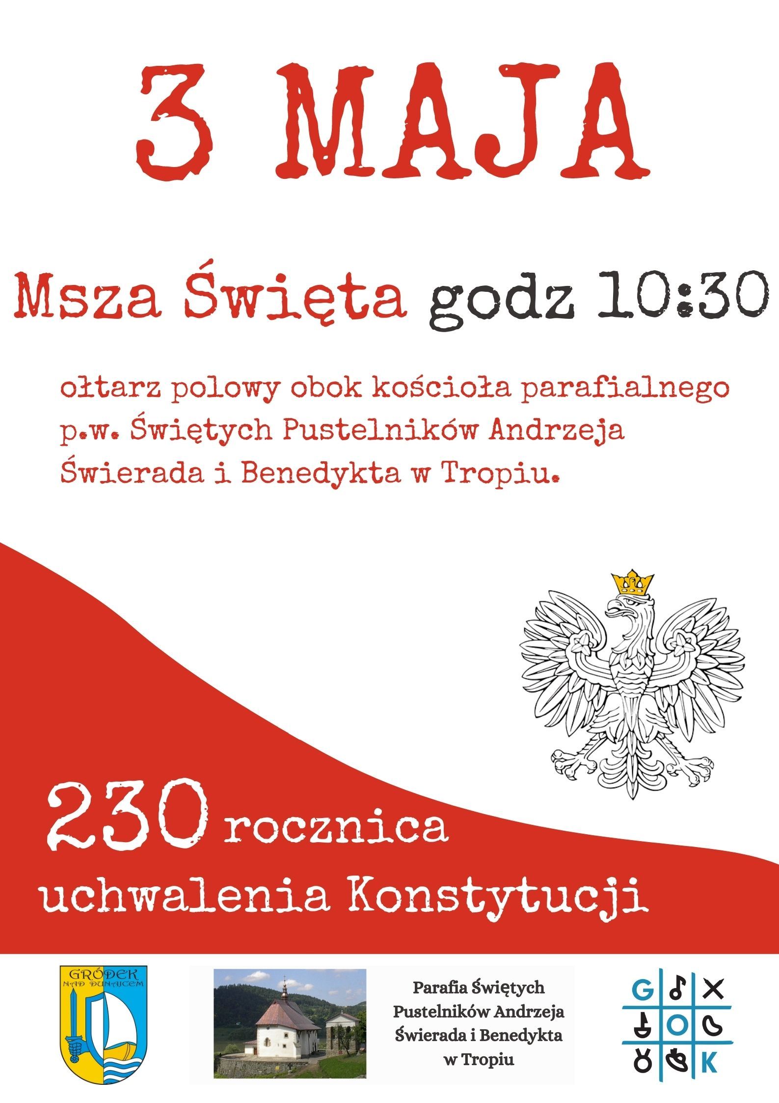 Dnia 3 maja o godzinie 10:30 zapraszamy na uroczystą Mszę Świętą do Sanktuarium Świętego Świerada w Tropiu. Msza polowa "pod żaglem" odbędzie się zgodnie z zasadami epidemiologicznymi. W razie niepogody Msza odbędzie się w kościele.