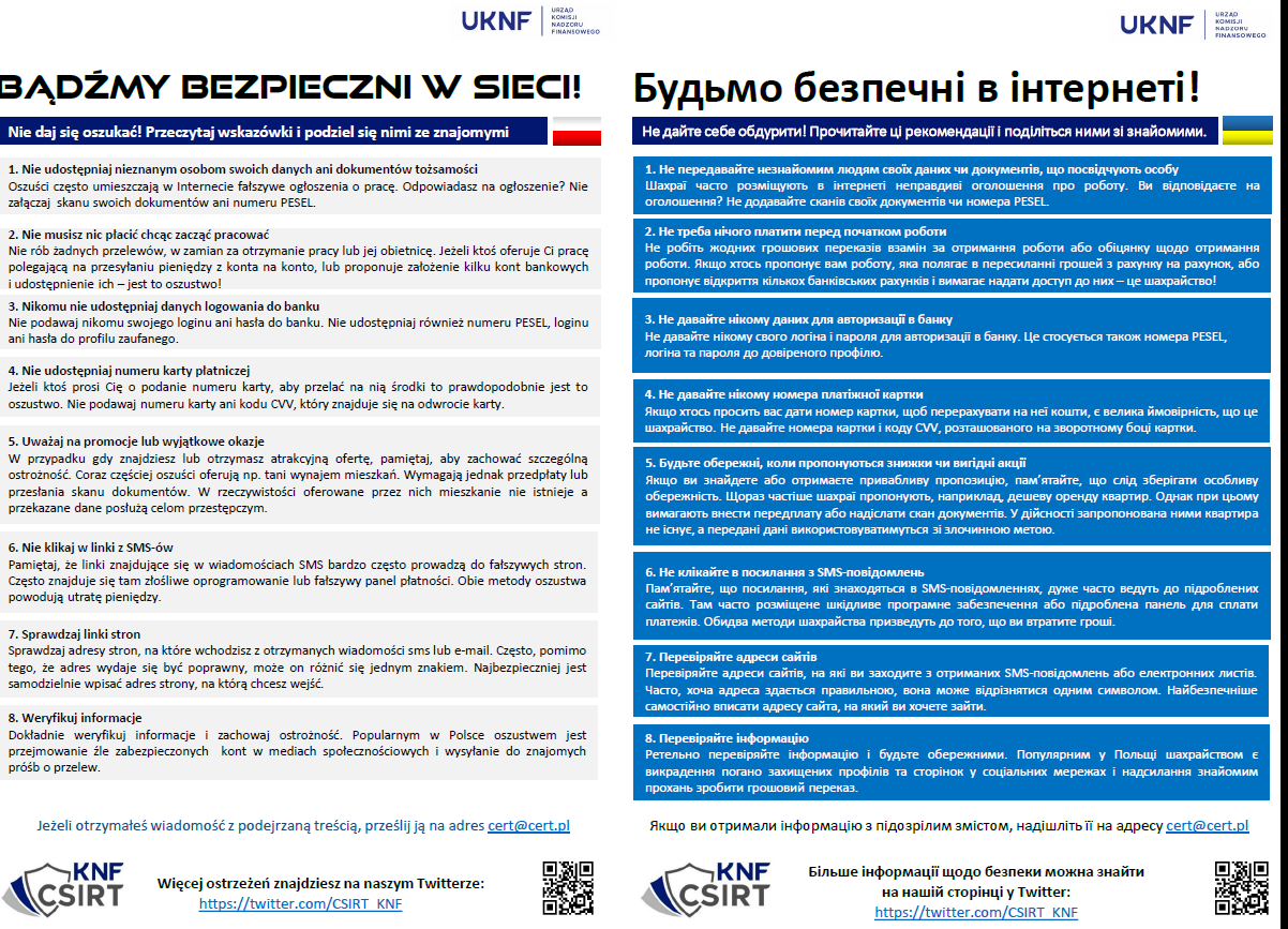 Urząd Komisji Nadzoru Finansowego przekazuje informację dla obywateli Ukrainy dotyczącą bezpieczeństwa w sieci.