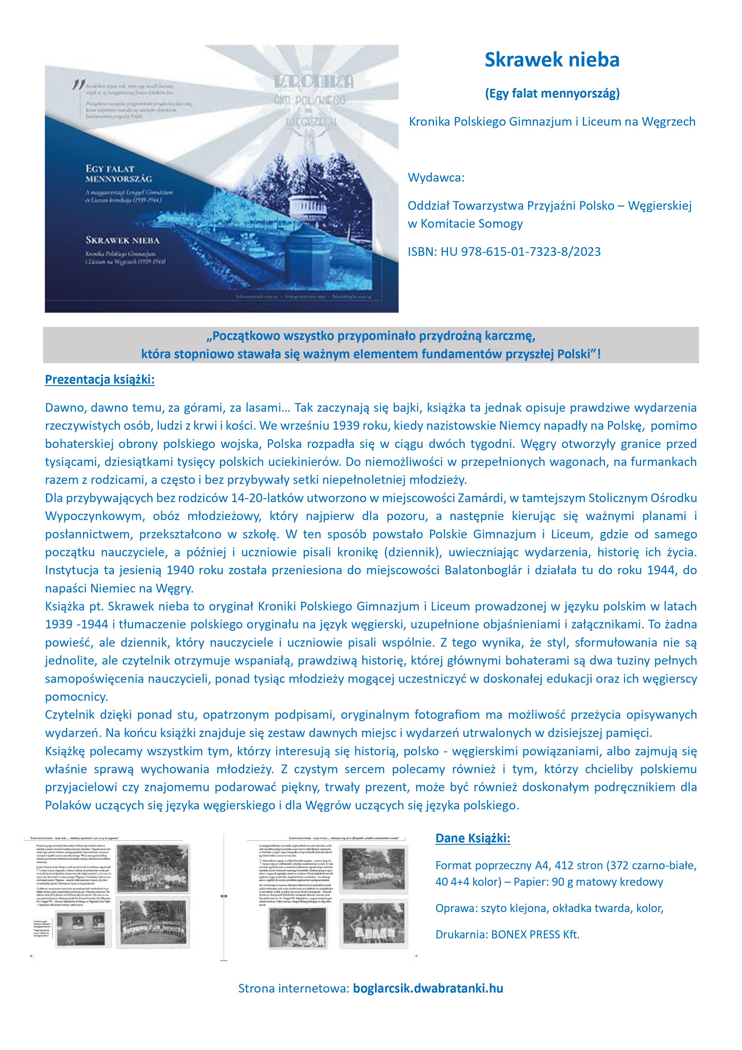 Wspomniane Polskie Gimnazjum i Liceum funkcjonowało na Węgrzech w czasie II Wojny Światowej a swoją siedzibę miało w Balatonboglar, mieście które od 2018 roku jest miastem partnerskim Gminy Gródek nad Dunajcem. W związku z tym bardzo cieszymy się że prezentacja tej bardzo wartościowej książki odbędzie się również w naszej gminie, a poprowadzi ją osobiście autor pan László Szentes.