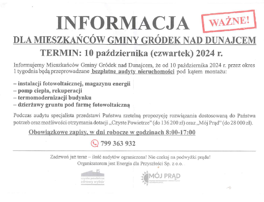 UWAGA - WAŻNA INFORMACJA ! 02.10.2024 15:33 Treść Urząd Gminy Gródek nad Dunajcem NIE prowadzi dystrybucji żadnych ulotek! Nie jest to pismo urzędowe, a firma nie działa w porozumieniu z Urzędem Gminy! Facebook Twitter Email Drukuj