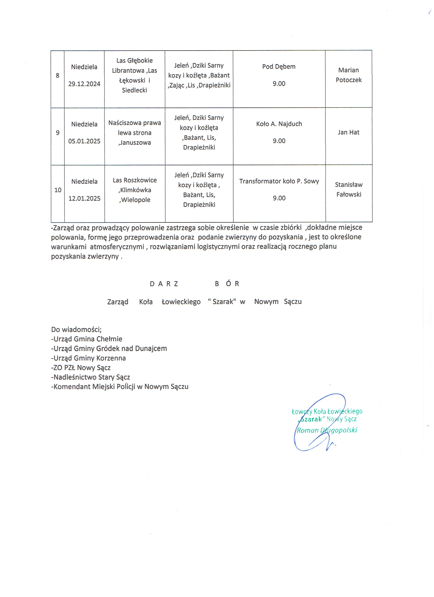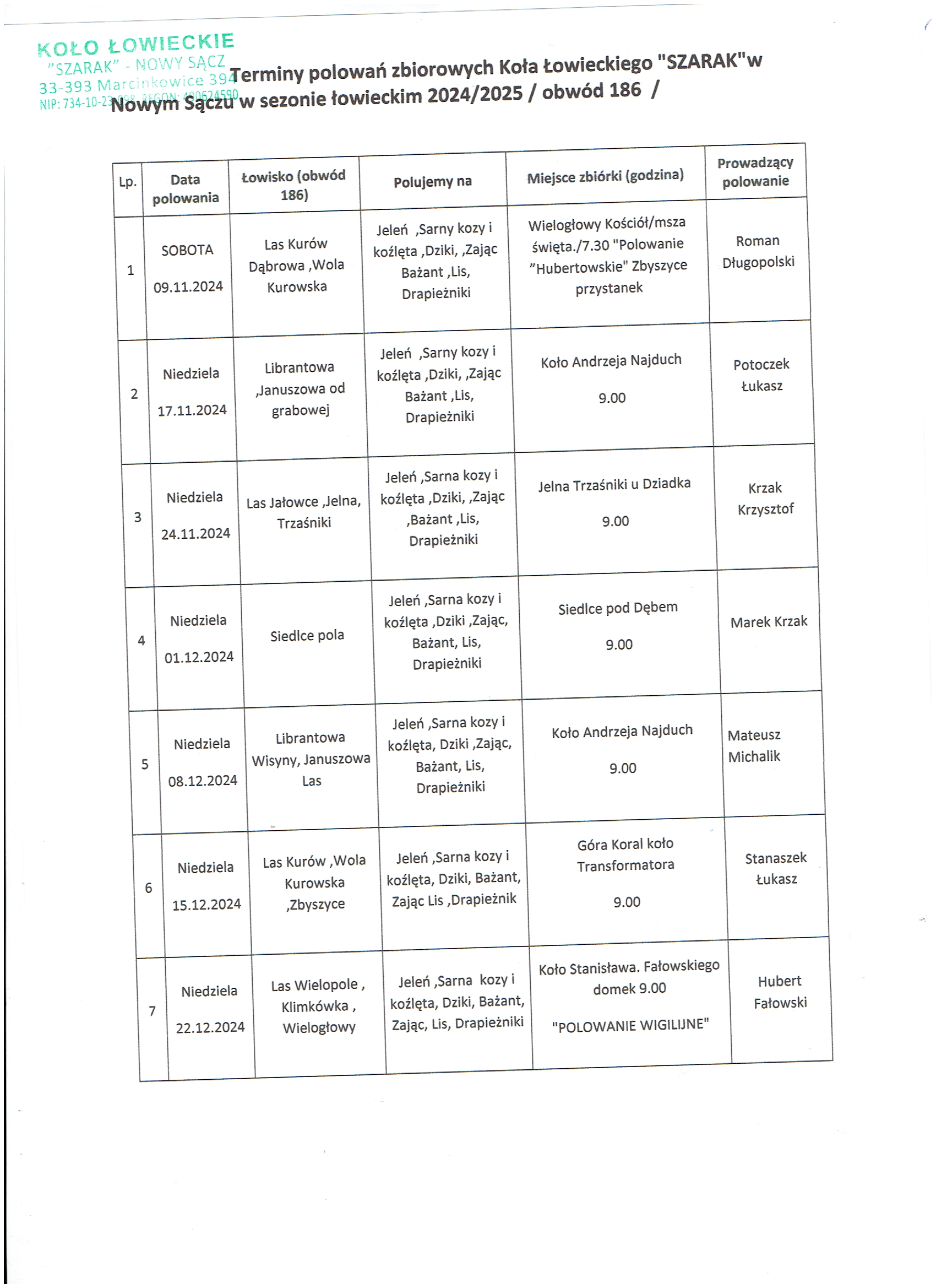 Wójt Gminy Gródek nad Dunajcem, działając na podstawie art. 42ab pkt 2 prawa łowieckiego podaje do publicznej wiadomości plan polowań Koła Łowieckiego SZARAK z Nowego Sącza w sezonie 2024/2025
