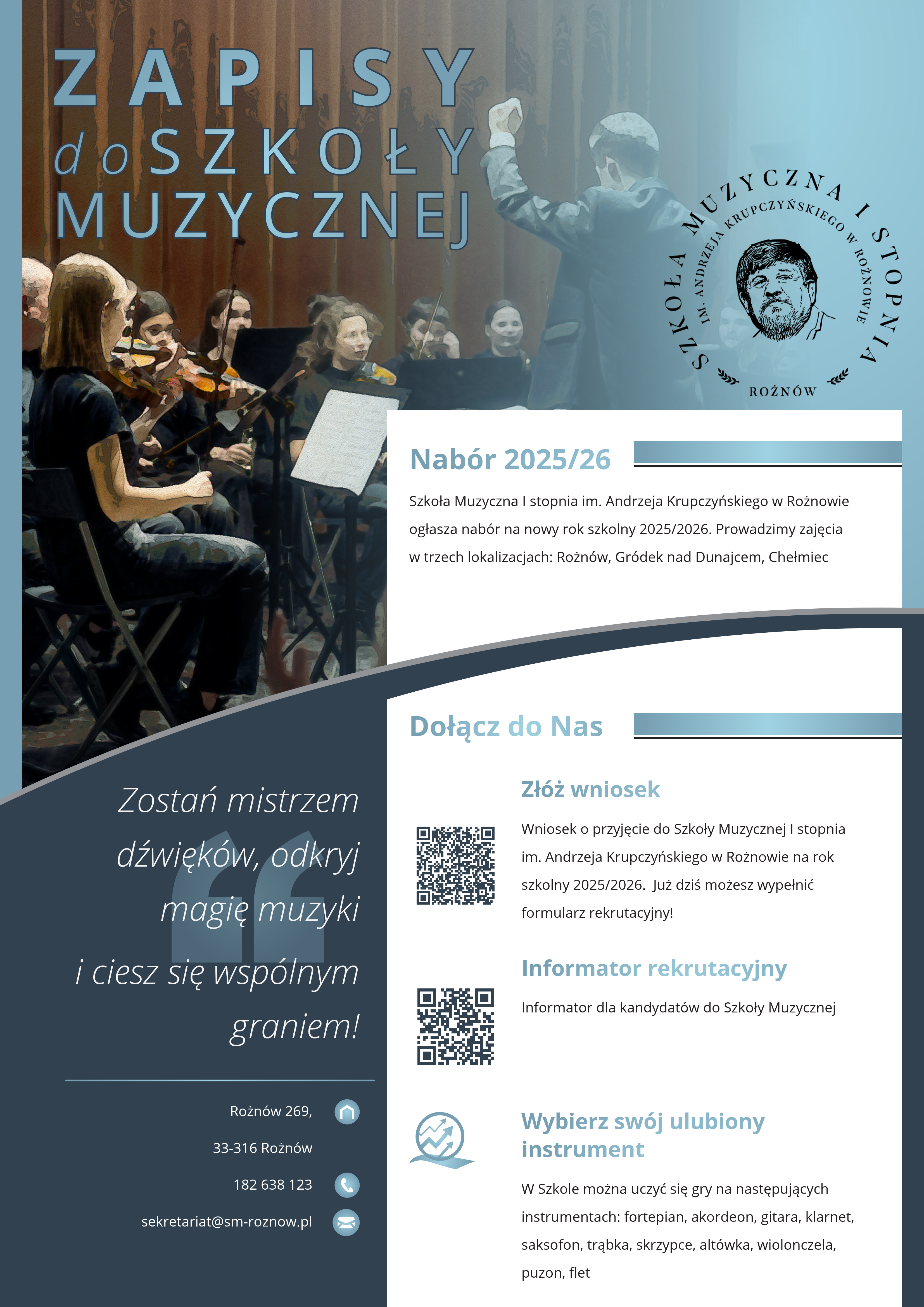 Szkoła Muzyczna I stopnia im. Andrzeja Krupczyńskiego w Rożnowie ogłasza nabór kandydatów chętnych do podjęcia nauki gry na wybranym instrumencie w roku szkolnym 2025/2026! To wyjątkowa szansa dla dzieci i młodzieży z Gminy Gródek nad Dunajcem, aby rozwijać swoje pasje muzyczne i kształcić talent pod okiem wykwalifikowanej kadry pedagogicznej.