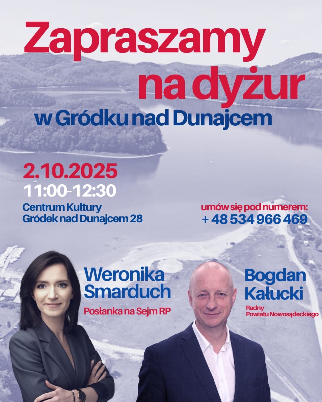 Posłanka na Sejm RP, Weronika Smarduch, zaprasza mieszkańców powiatu nowosądeckiego na dyżur poselski, który odbędzie się w Gródku nad Dunajcem i Łososinie Dolnej 02.10.2025, tj. w czwartek. Posłanka poprowadzi dyżur wspólnie z Panem Bogdanem Kałuckim, Radnym powiatu nowosądeckiego. To doskonała okazja, aby mieszkańcy mogli bezpośrednio podzielić się swoimi uwagami, problemami oraz propozycjami dotyczącymi funkcjonowania naszego regionu i kraju. Pierwszy dyżur odbędzie się w Gródku nad Dunajcem w godzinach od 11:00 do 12:30 w Centrum Kultury Gródek nad Dunajcem 28. Drugi dyżur odbędzie się tego samego dnia, tj. 02.10.2025, Łososinie Dolnej, w godzinach od 13:00 do 14:30 w Urzędzie Gminy Łososina Dolną 300. Pani Posłanka zachęca do skorzystania z możliwości bezpośredniego kontaktu i rozmowy na temat najważniejszych spraw lokalnych oraz legislacyjnych. Dyżur poselski to także szansa na zgłoszenie spraw wymagających interwencji lub wsparcia na poziomie parlamentarnym. W trosce o komfort i bezpieczeństwo prosimy o wcześniejsze umówienie spotkania pod numerem telefonu: +48 534 966 469.